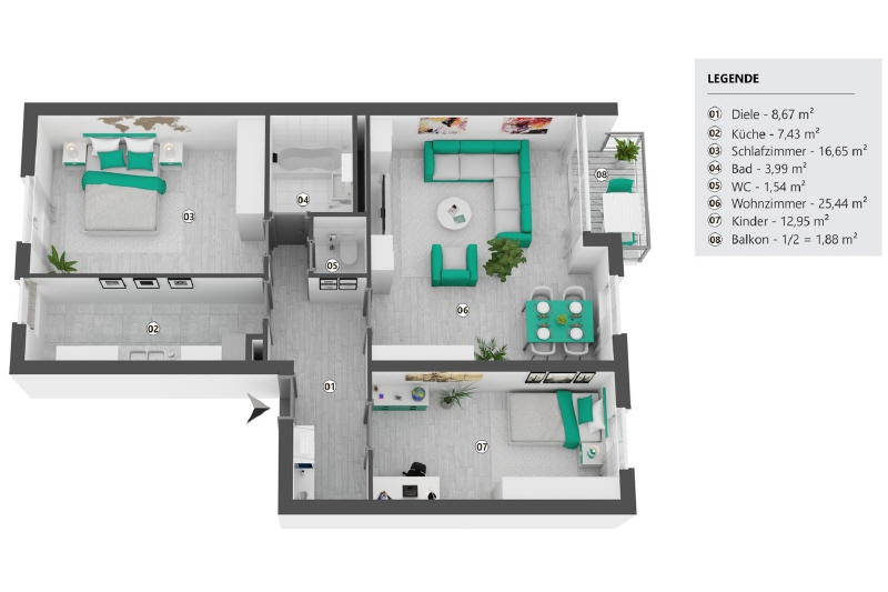 Grundrissgestaltung, die viel Tageslicht, Funktionalität und Wohnkomfort vereint. Der großzügige Flur verbindet alle Räume harmonisch und schafft eine einladende Wohnatmosphäre. Das Wohnzimmer bildet das Herzstück der Wohnung und besticht durch große Fensterfronten, die für eine freundliche, helle Ausstrahlung sorgen. Von hier aus gelangen Sie direkt auf den Balkon, der den Wohnbereich ideal ins Freie erweitert. Die separate Küche bietet vielfältige Möglichkeiten zur Gestaltung einer modernen Einbauküche. Das ruhig gelegene Schlafzimmer verfügt über ausreichend Platz für ein großes Bett sowie einen geräumigen Kleiderschrank. Auch hier sorgt ein großes Fenster für eine angenehme Helligkeit. Ein weiteres Zimmer kann flexibel als Kinder-, Gäste- oder Arbeitszimmer genutzt werden. Das Badezimmer ist mit einer Badewanne, einem Waschbecken und einem Waschmaschinenanschluss ausgestattet, während ein separates Gäste-WC zusätzlichen Komfort bietet. Abgerundet wird das Angebot durch ein eigenes Kellerabteil (ca. 4,5 m²), einen gemeinschaftlich genutzten Fahrradkeller sowie eine Münzwaschmaschine und
