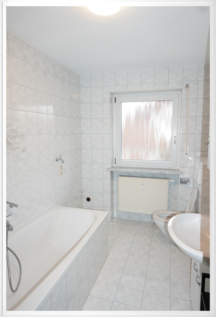 Im hell gefliesten Badezimmer befindet sich eine Badewanne, Dusche, Waschmaschinenanschluss und ein Fenster.