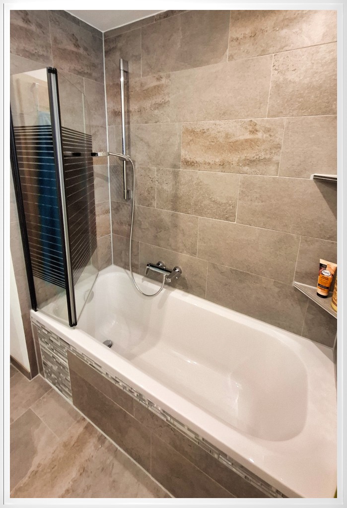 Modernes neu und geschmackvoll gestaltetes Badezimmer. Separates WC.