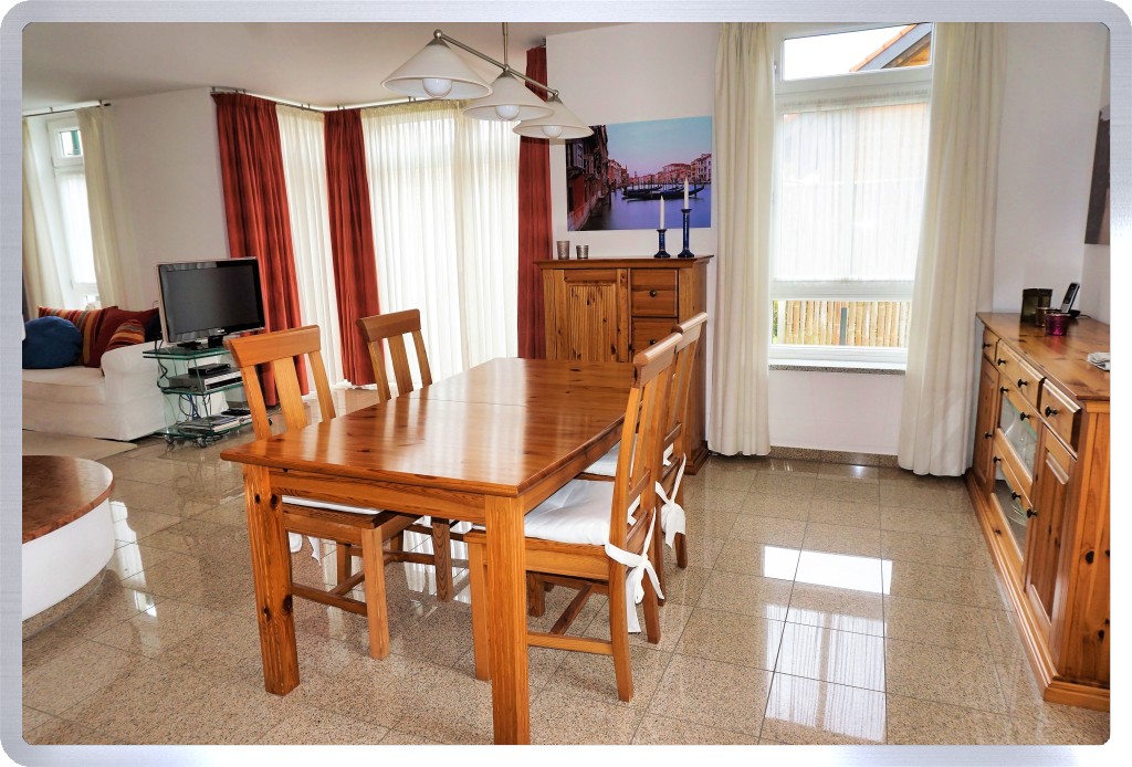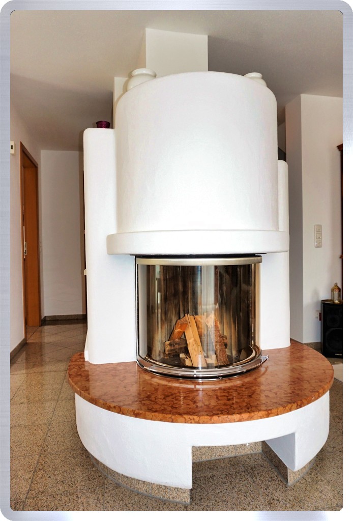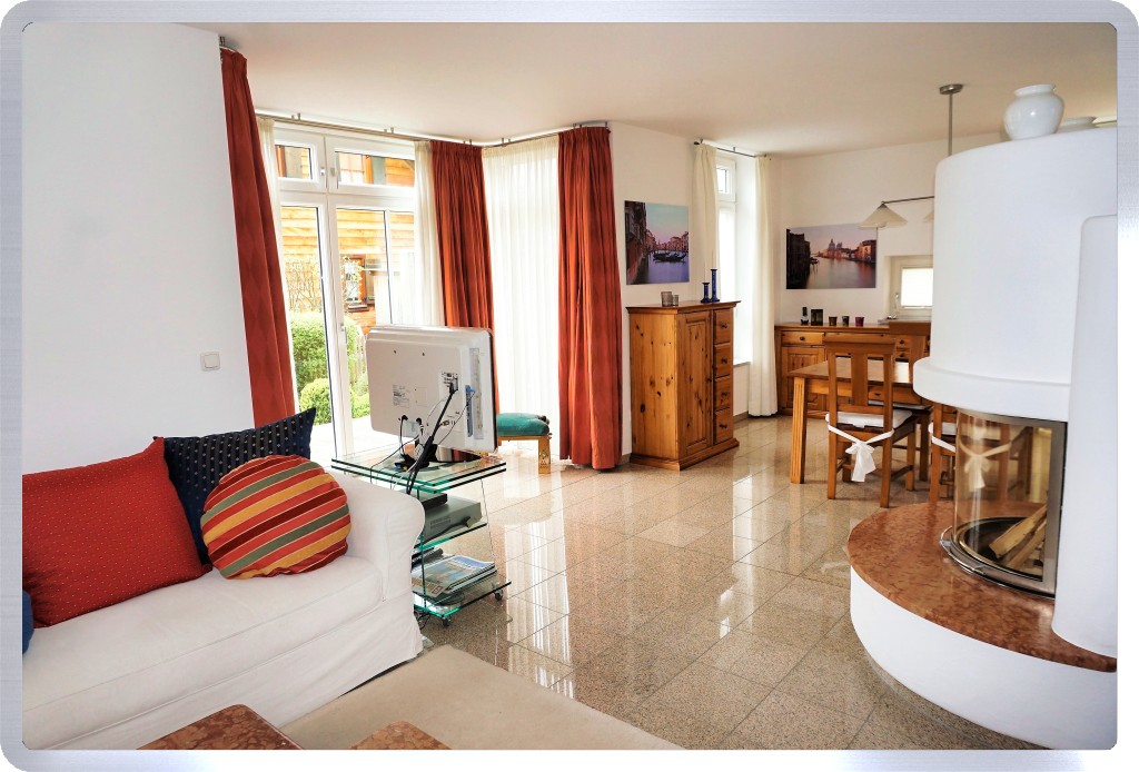 in den großen, lichtdurchfluteten Wohn- und Essbereich. Die vielen Fenster, ein kleiner Erker mit zwei großen Terrassen-Flügeltüren und ein Kaminofen mit einer 180 Grad Glasscheibe inklusive einer gefliesten Rosso Asiago Umrandung, geben dem ca. 37 m² großen Raum eine sehr freundliche und behagliche Wohn-Atmosphäre.