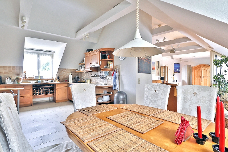 Die Küche präsentiert sich funktional und charakterstark – ein Raum mit Struktur und klarer Linie, der zugleich viel Potenzial für eine individuelle Neugestaltung bietet. Ob offenes Wohnküchenkonzept, stilvolle Modernisierung oder kreative Lösungen für den Alltag: Hier lassen sich Ihre Ideen verwirklichen. Der angrenzende Essbereich lädt zu geselligen Runden mit Familie und Freunden ein und verbindet Kochen und Genuss auf harmonische Weise.